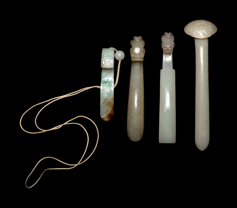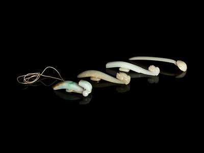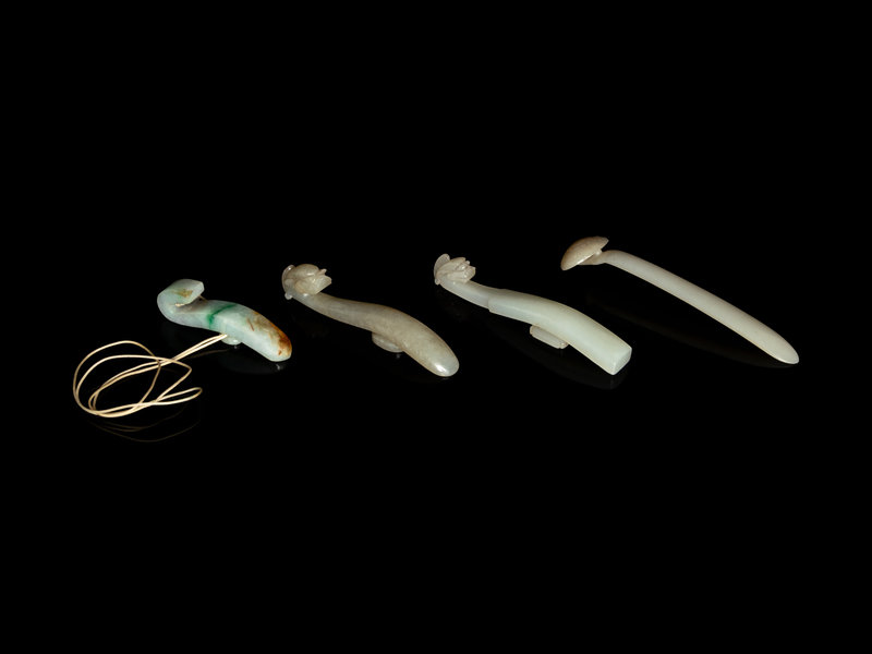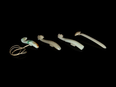 comprising two jade dragon-head belt hooks, one jadeite belt hook incised with a shou character, and a pale celadon jade ruyi-head hairpin.