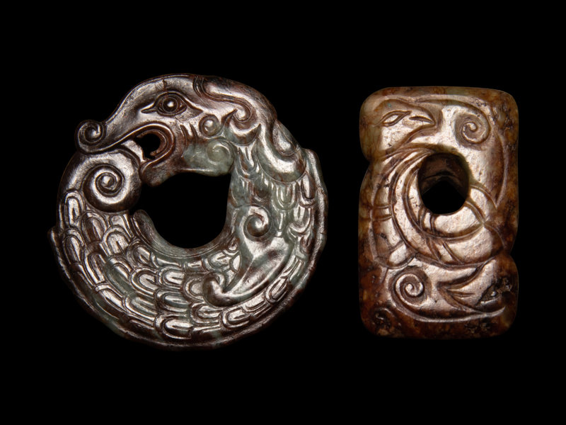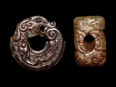 the first of circular form, depicting a crouching chilong, the body carved with detailed scales, the second of rectangular form, depicting a crouching phoenix.