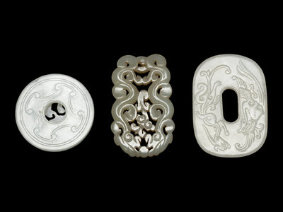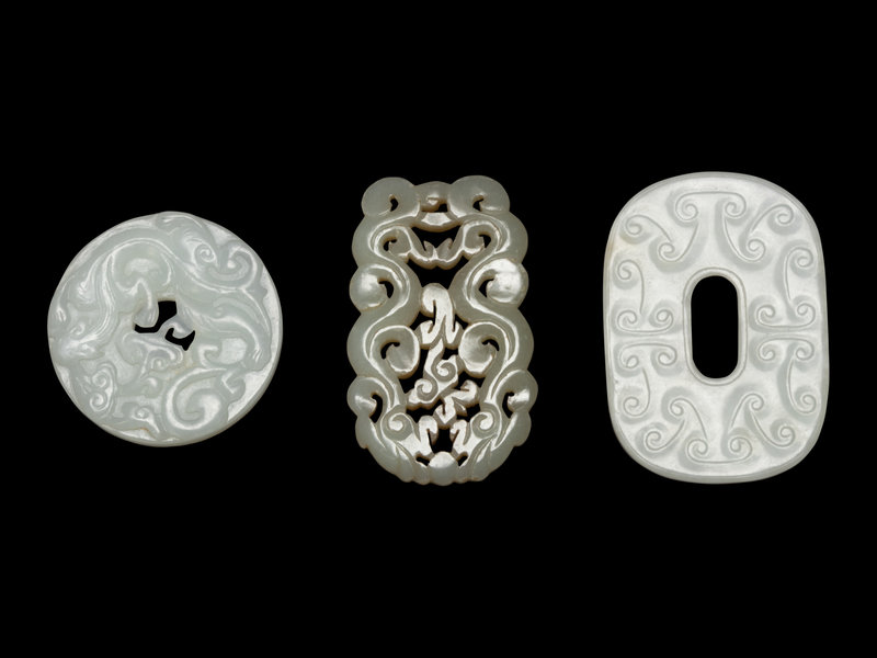 the first of circular form carved with a sinuous cilong, the second reticulated with lingzhi sprigs and a bat, the third of oval form.
