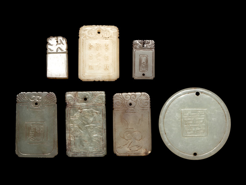comprising four rectangular examples. one white jade with a figural scene, the others celadon, two petite rectangular examples, and one of compressed medallion form, with two drilled piercings.