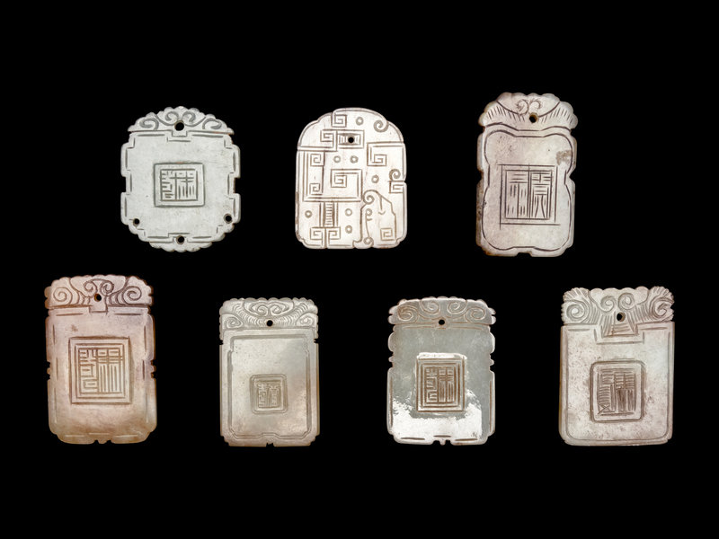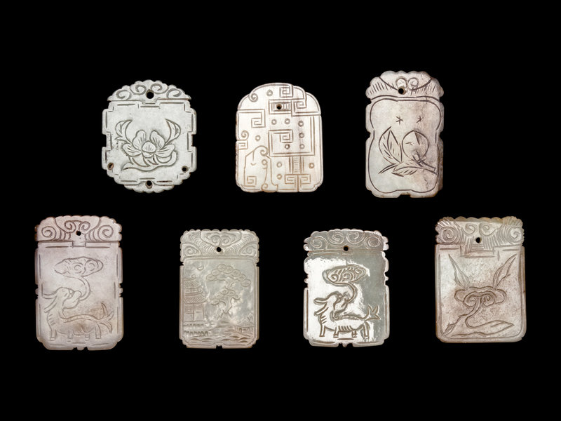 Seven Chinese Celadon Jade Carved Plaques