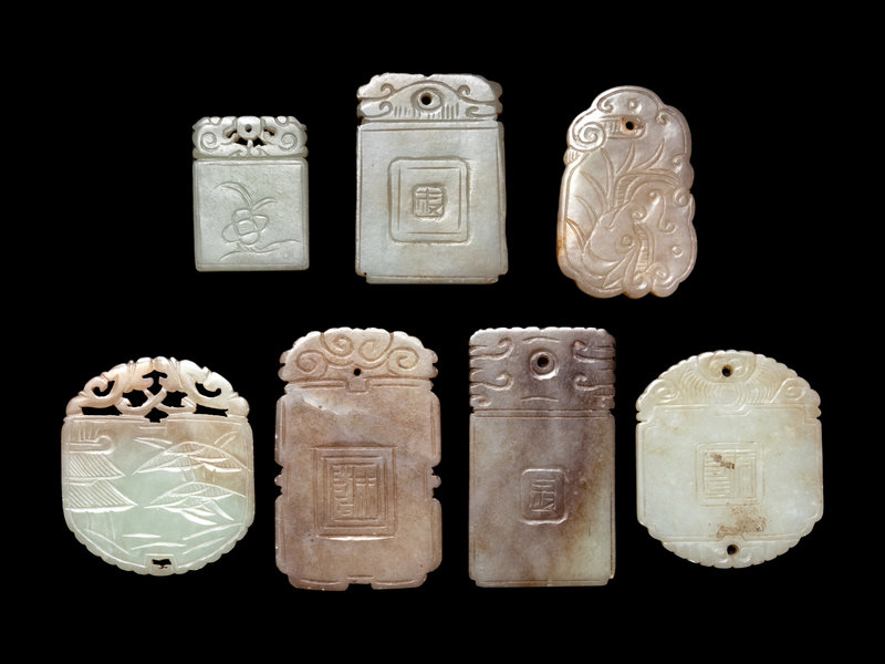 Seven Chinese Celadon Jade Carved Plaques