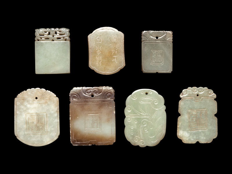 comprising one smoothly polished example, and six examples incised with botanical motifs opposite inscriptions.