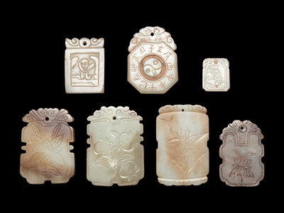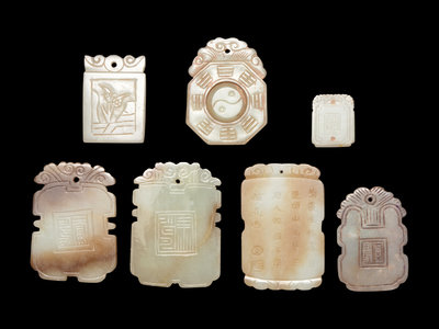 comprising six rectangular examples, and one example with a trigram enclosing a freely moving center.
