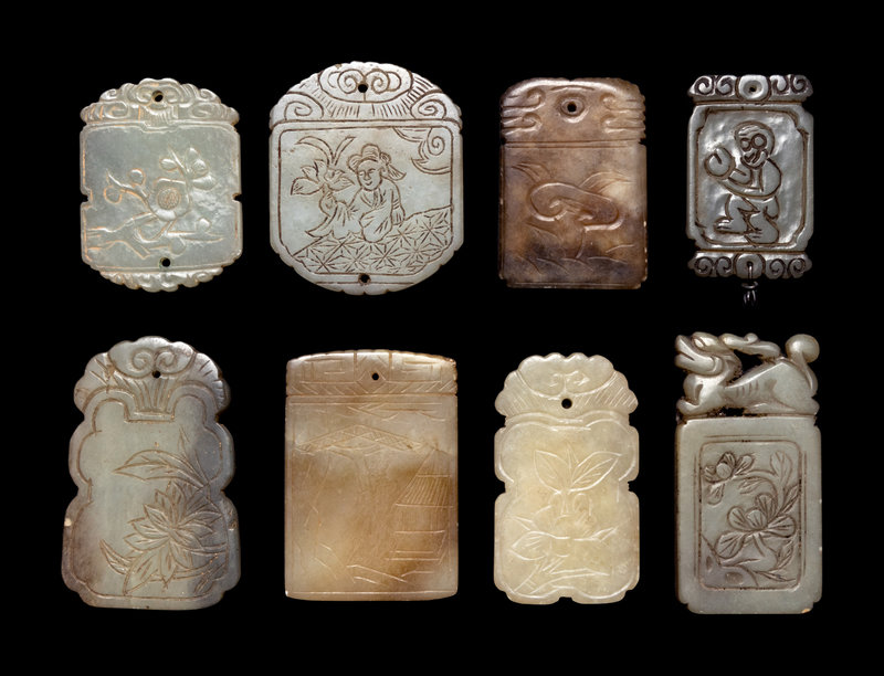 five incised with flowers and fruits, one carved with a monkey holding a peach, one carved a lady, one incised with landscape.