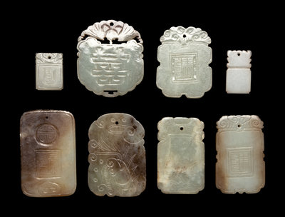 comprising six larger examples incised with botanical motifs opposite inscriptions, and two petite examples, each pierced as a pendant.