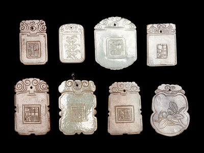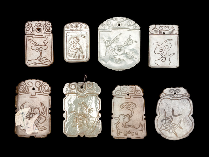 one carved with a boy, three carved with Lingzhi sprig, one carved with a mythical beast, three carved with flowers.