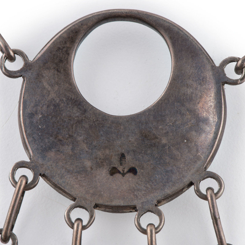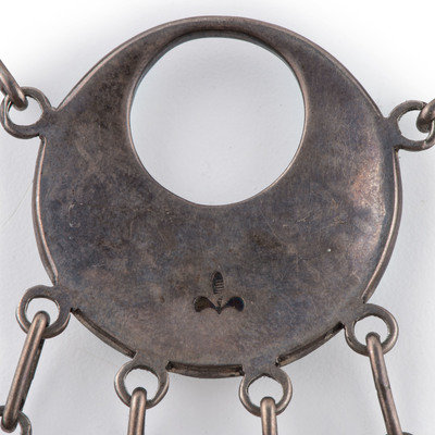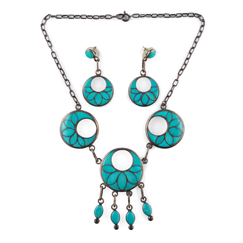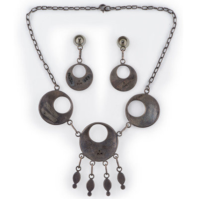 necklace length 16 inches, weight 25.2 dwt.; earring length 1 7/8 inches x width 1 inch, weight 7.7 dwt.