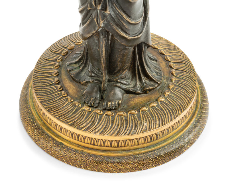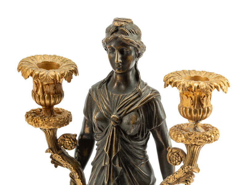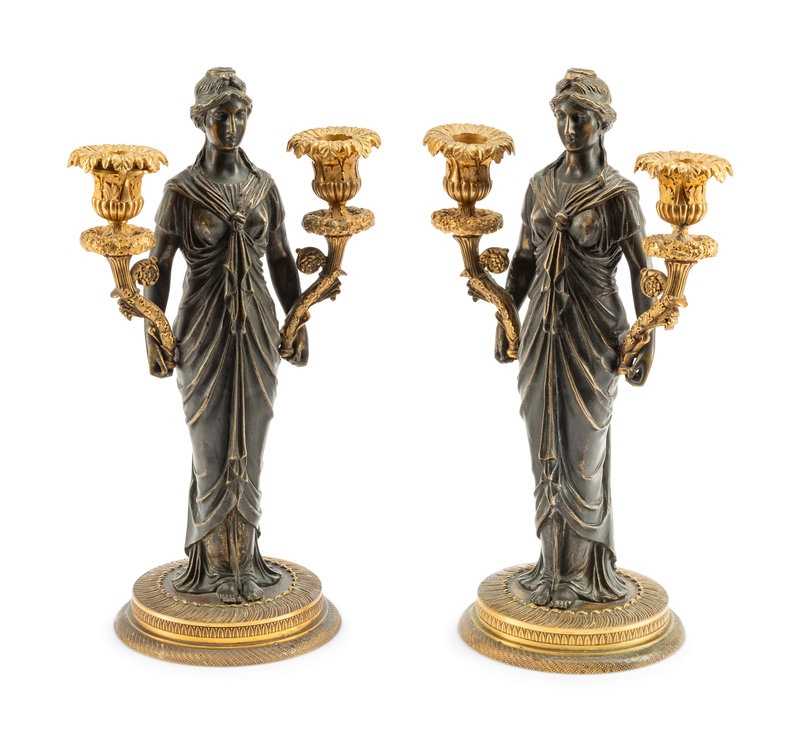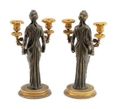 A Pair of Empire Style Gilt and Patinated Bronze Figural Two-Light Candelabra