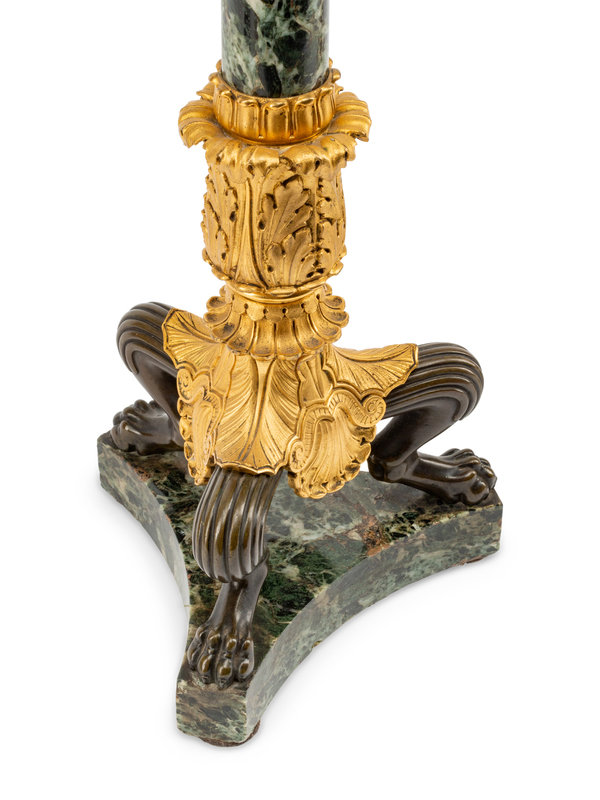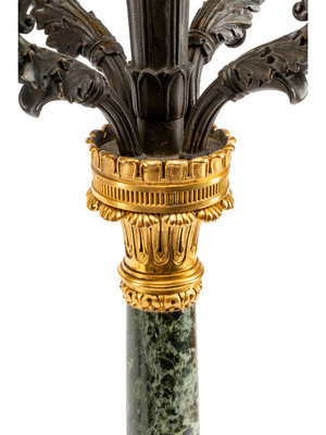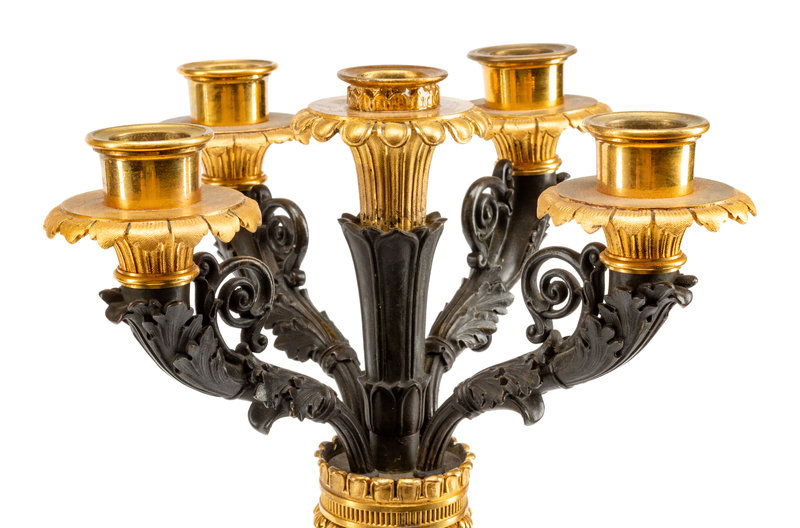 A Pair of Empire Style Gilt and Patinated Bronze and Marble Five-Light Candelabra