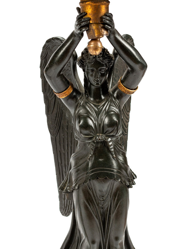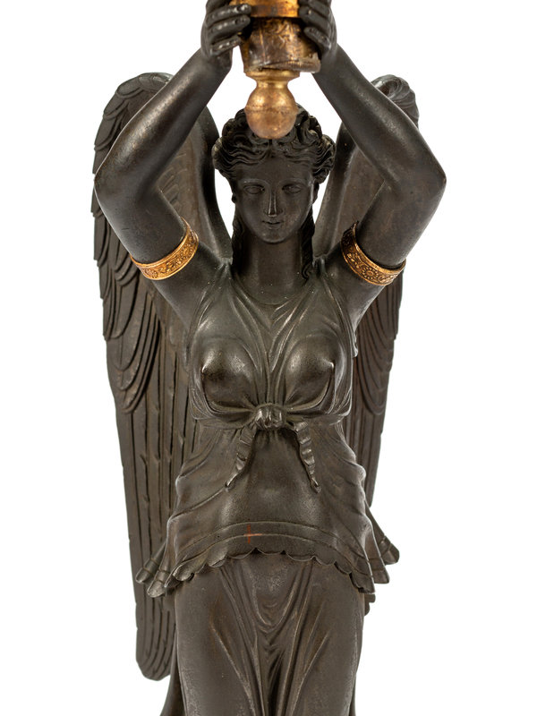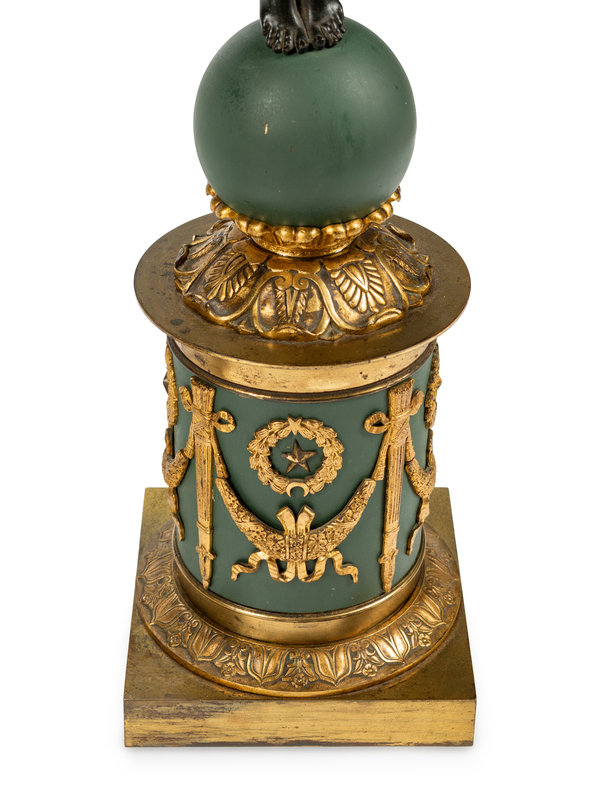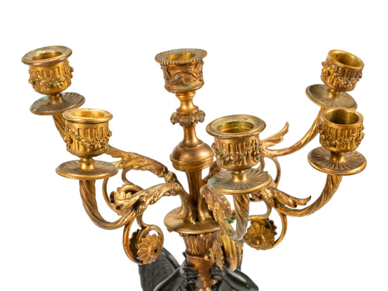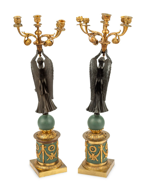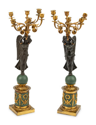 A Pair of Empire Style Gilt and Patinated Bronze and Tôle Six-Light Candelabra