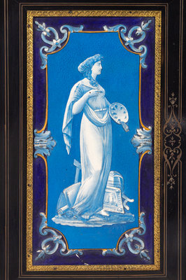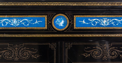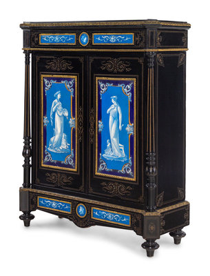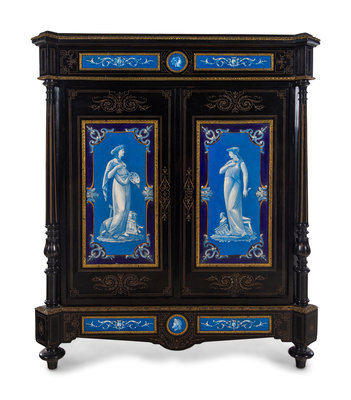 A Napoleon III Ebonized and Glazed Pottery Plaque-Mounted Marble-Top Meuble d'Appui