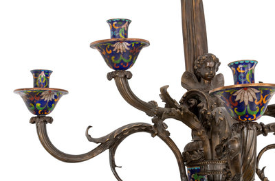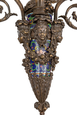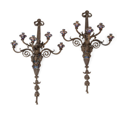 A Pair of Neoclassical Bronze and Cloisonné Five-Light Sconces