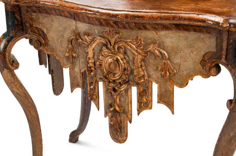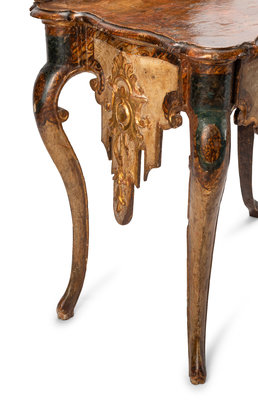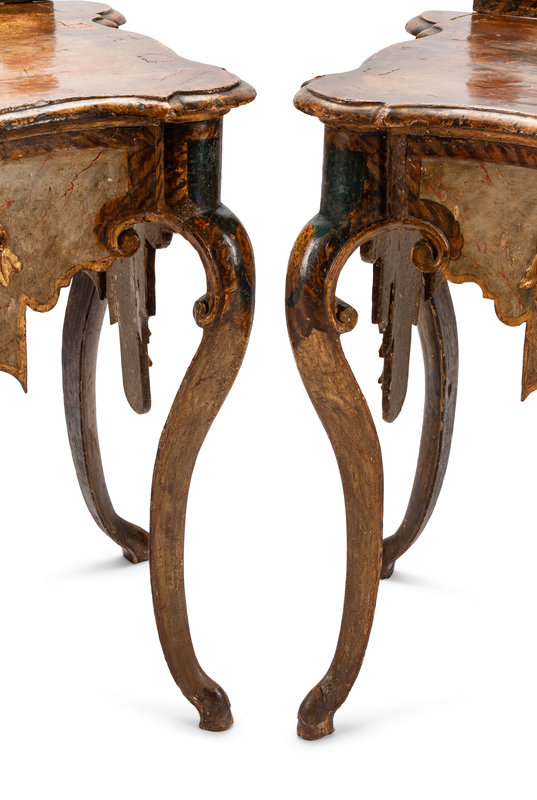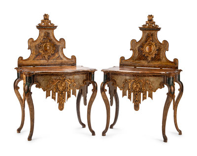 A Pair of Venetian Painted and Parcel Gilt Console Tables