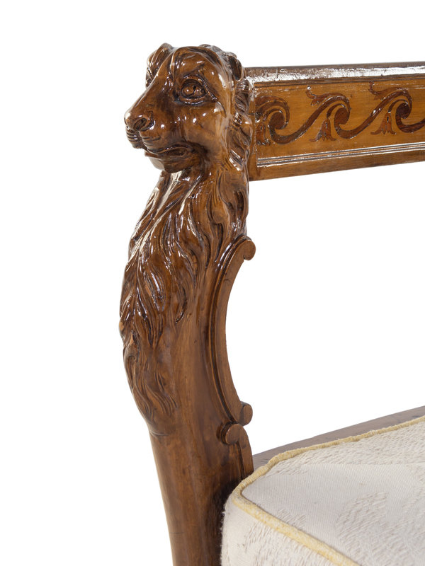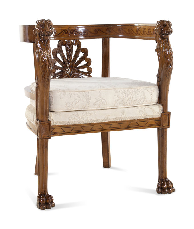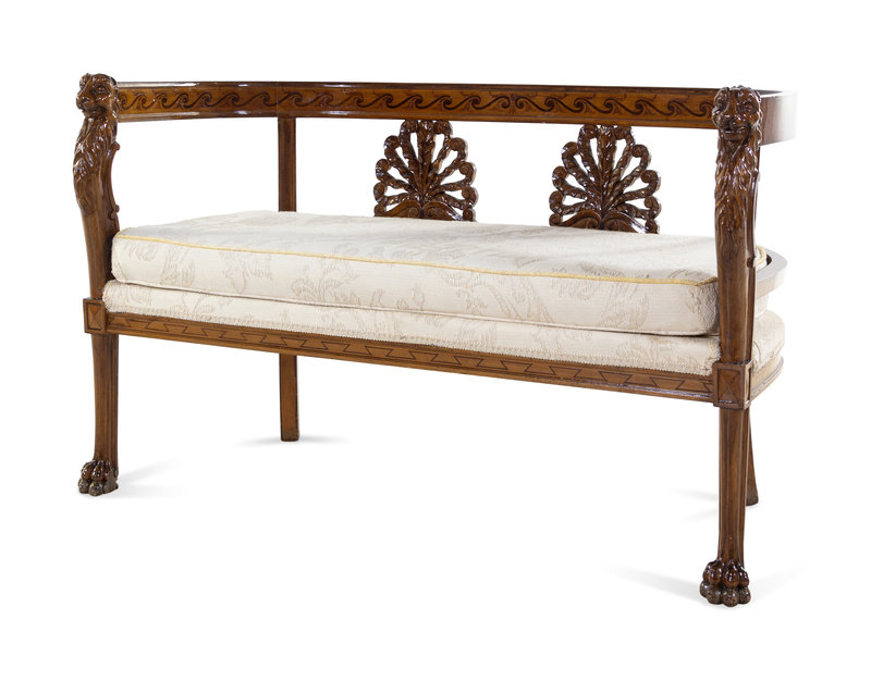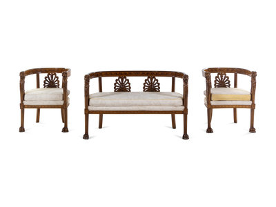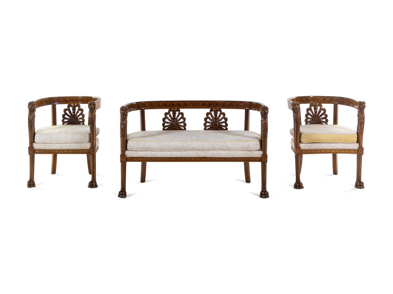 An Italian Neoclassical Style Carved Walnut and Parquetry Three-Piece Salon Suite