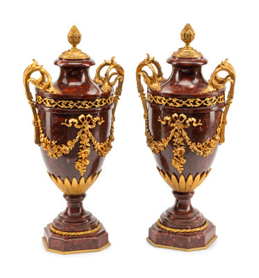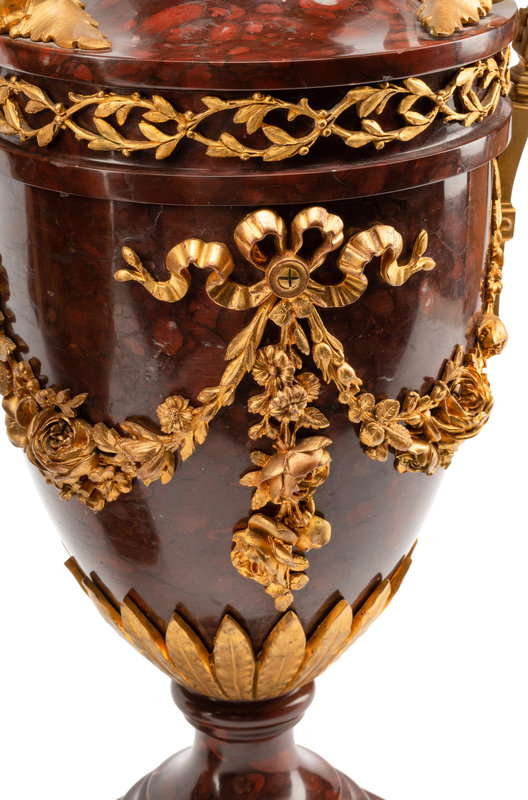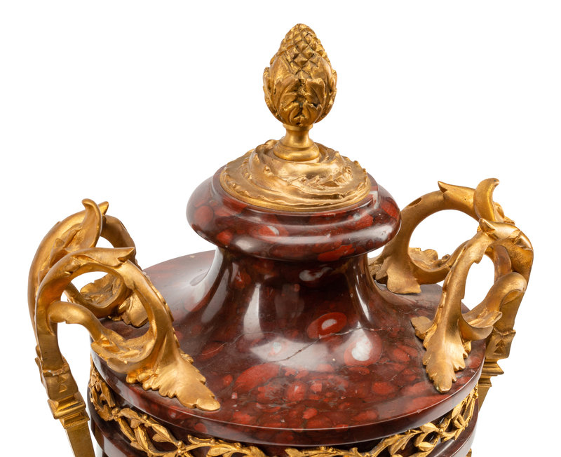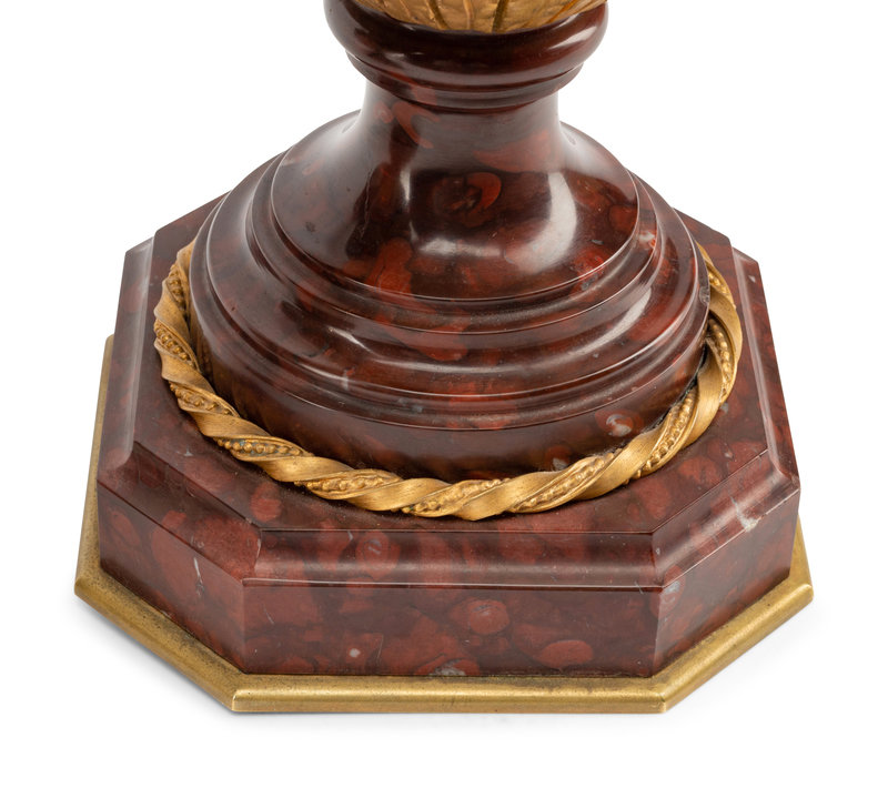 A Pair of Gilt Bronze Mounted Rouge Griotte Marble Urns
