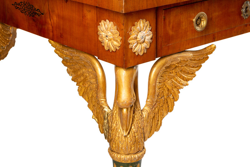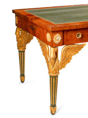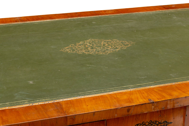 An Austrian Empire Style Fruitwood Veneered, Painted and Parcel Gilt Bureau Plat