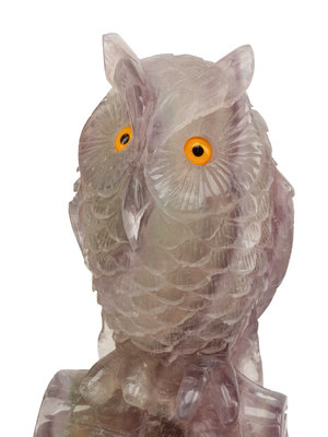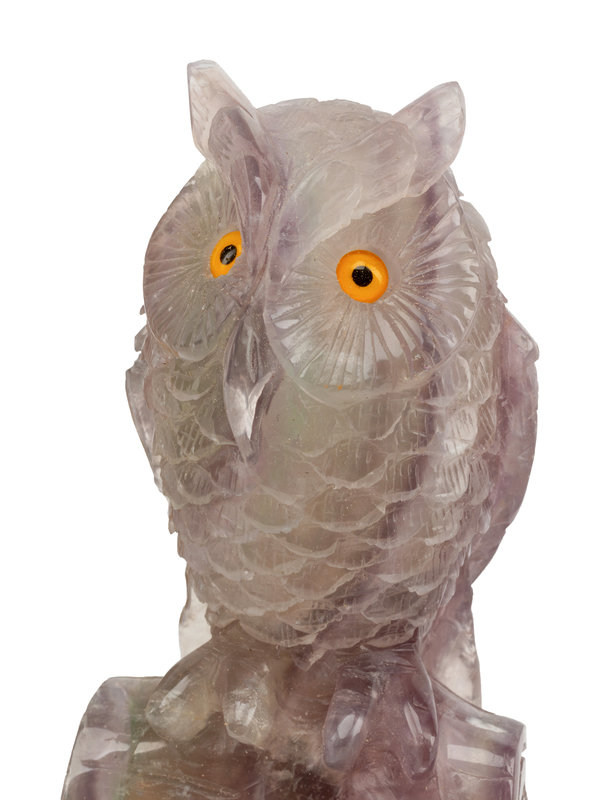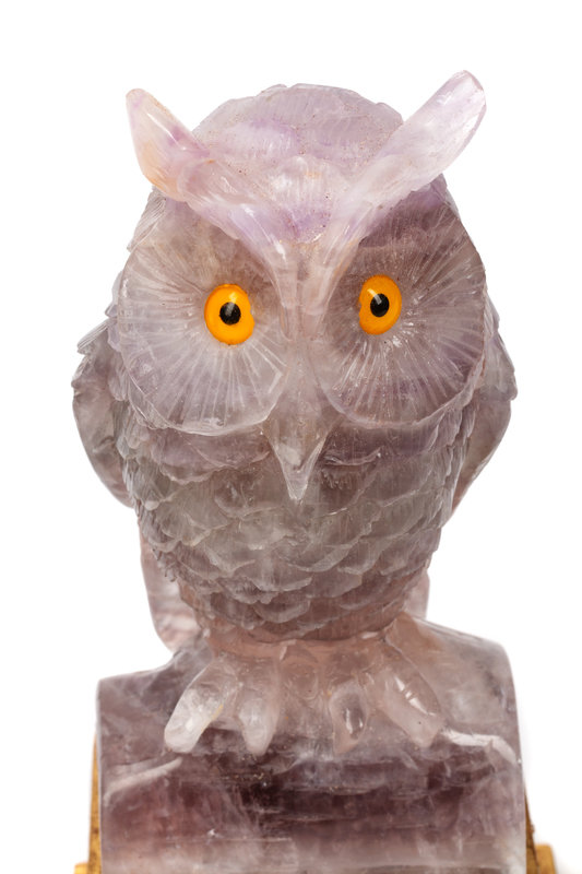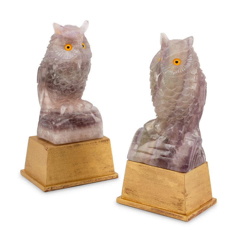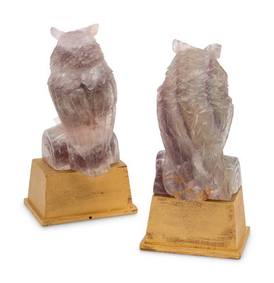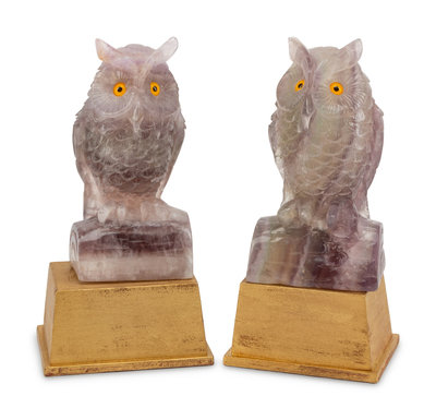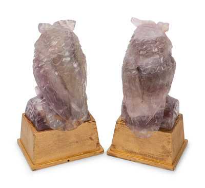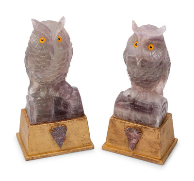 A Pair of Carved Amethyst Owls with Carved Wood Bases