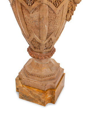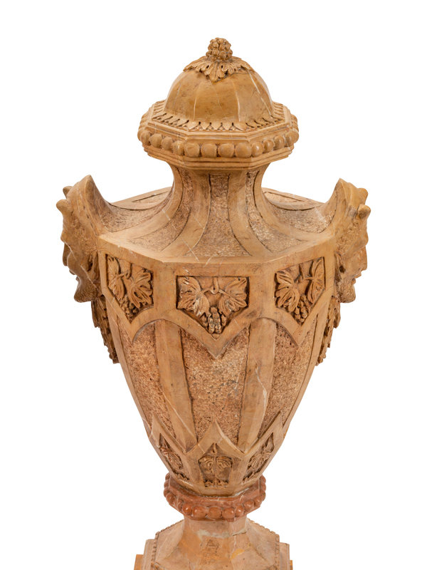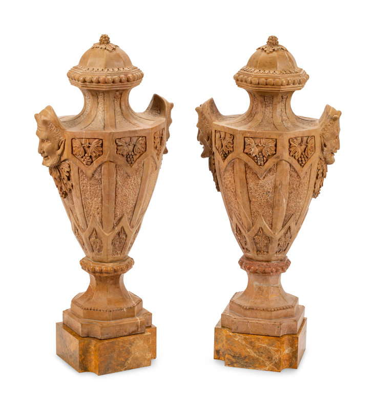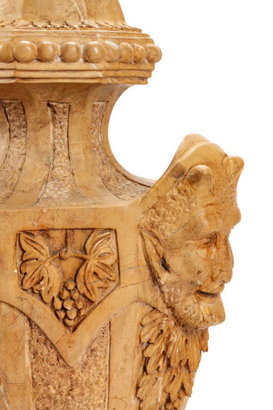 A Pair of Gothic Style Marble Urns with Satyr Handles