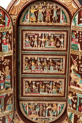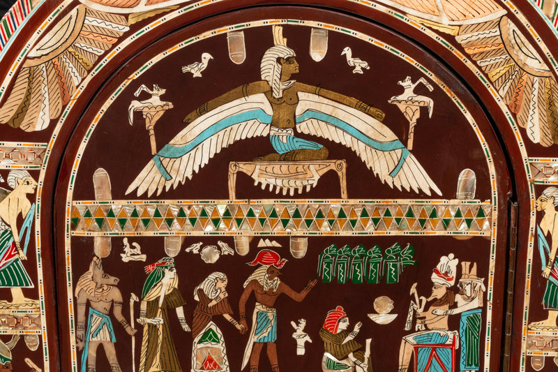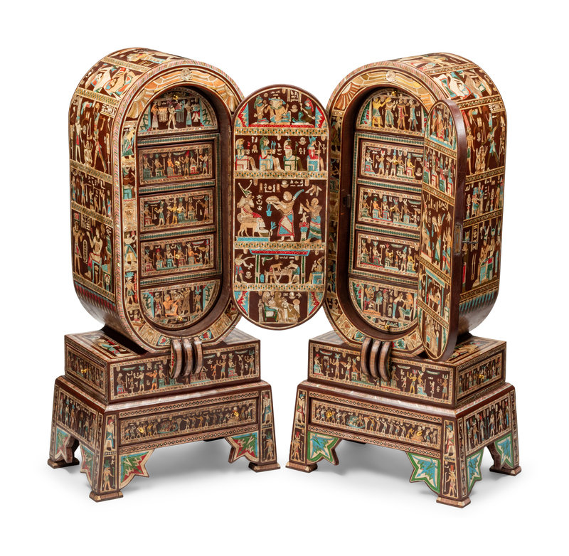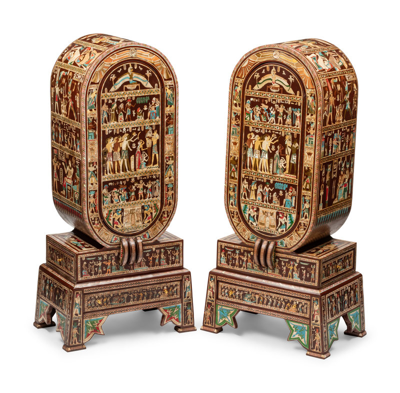 A Pair of Egyptian Style Painted and Inlaid Cabinets