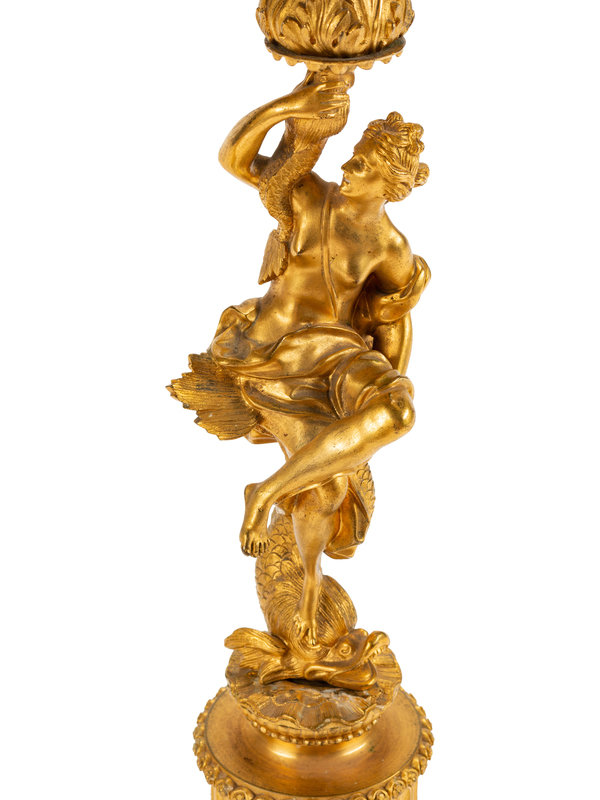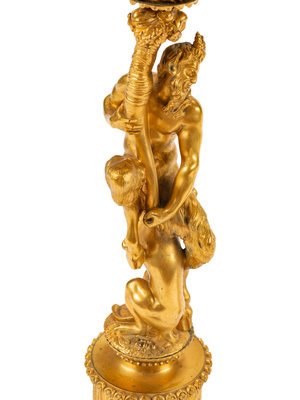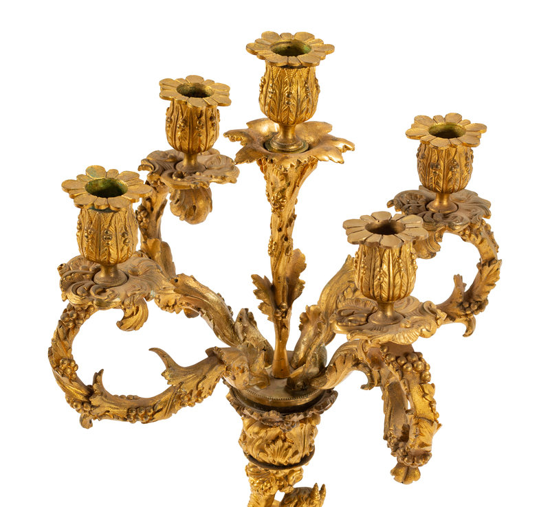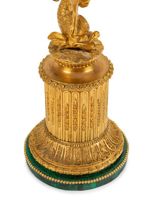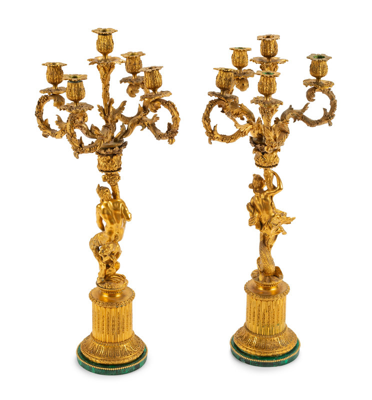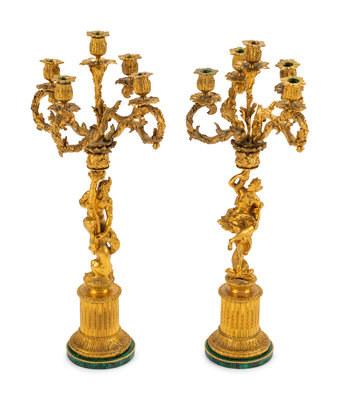 A Pair of Continental Gilt Bronze Figural Five-Light Candelabra with Malachite Veneered Bases