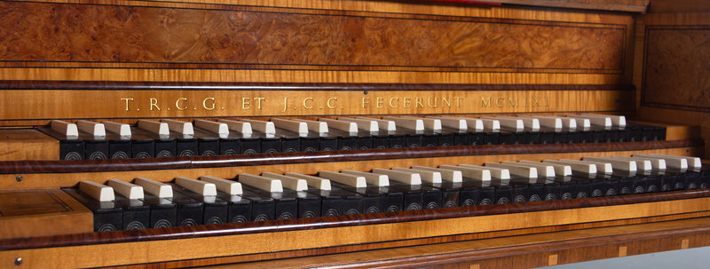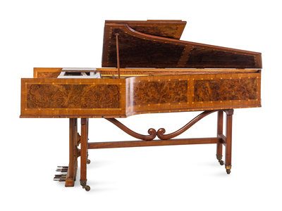A Burl Walnut and Satinwood Two-Manual Harpsichord by Thomas Goff & Joseph Cobby