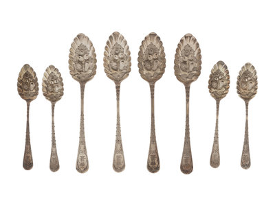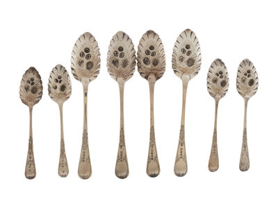 comprising a set of four and an assembled set of ten smaller examples, in a later fitted case.