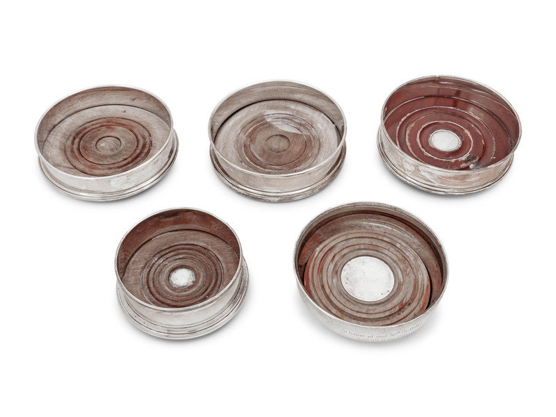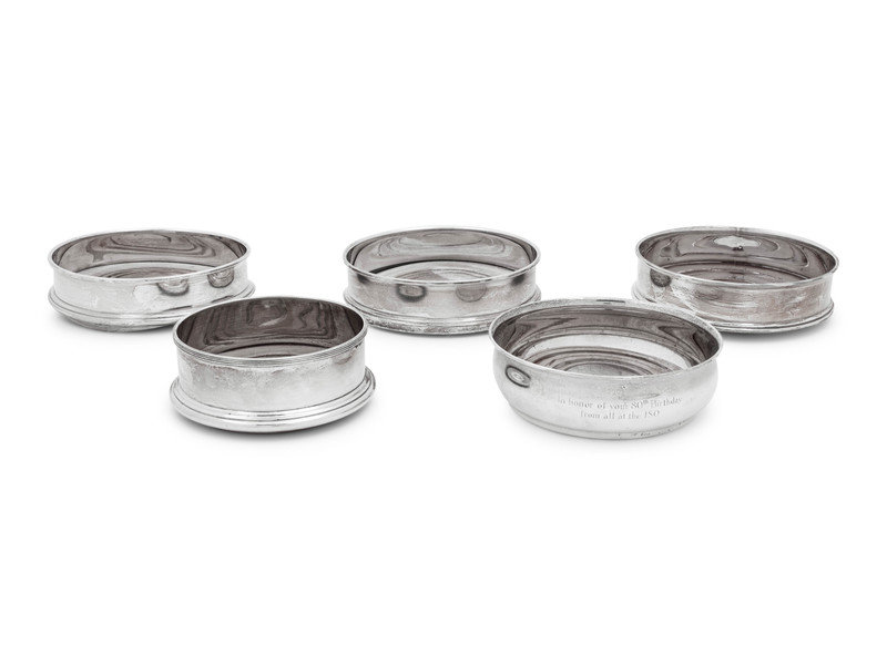 comprising two examples by David Show & Martin Collins, London, 1975; an example by Mappin & Webb, London, 1995 and an example by R. Carr, Ltd., Sheffield, 2000; together with a fifth American example with engraved inscription In honor of your 80th Birthday/ from all at the ISO, Tiffany & Co., New York; each with molded wood bases.