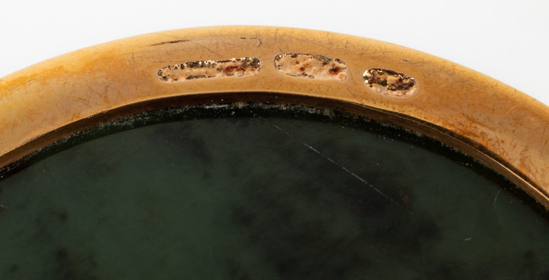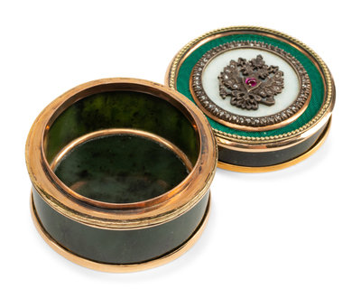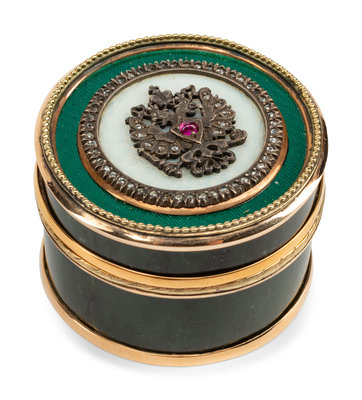 A Guilloché Enamel, Vari-Color Gold, Diamond, Ruby and Spinach Jade Circular Box