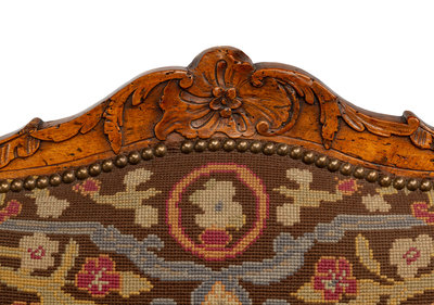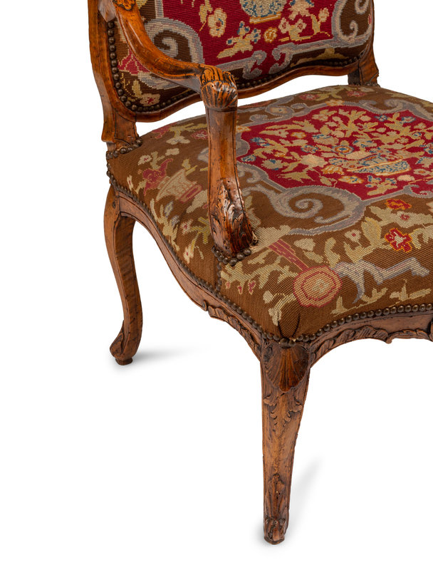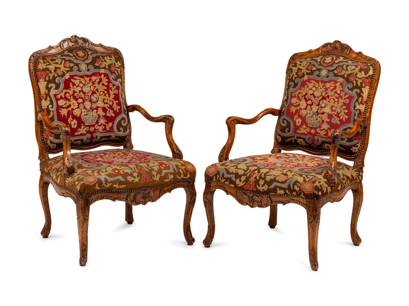 A Pair of Régence Walnut Needlepoint-Upholstered Fauteuils