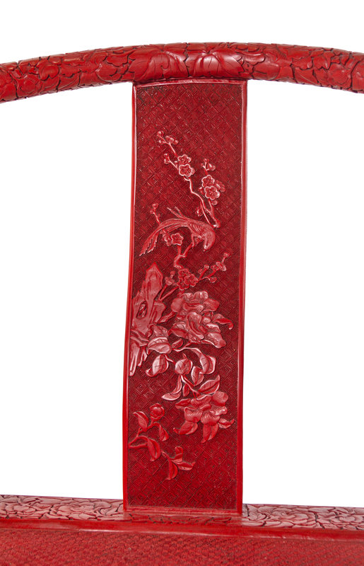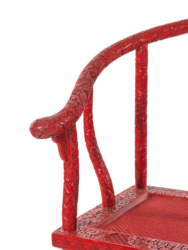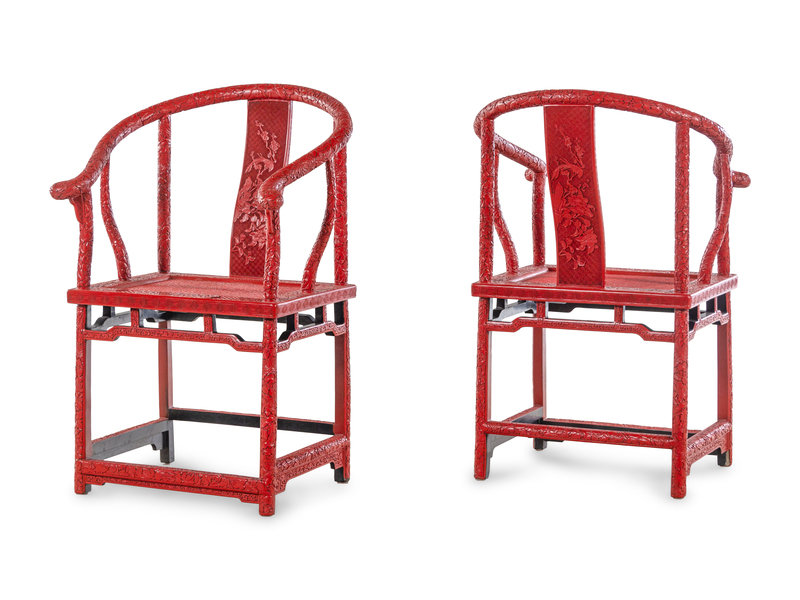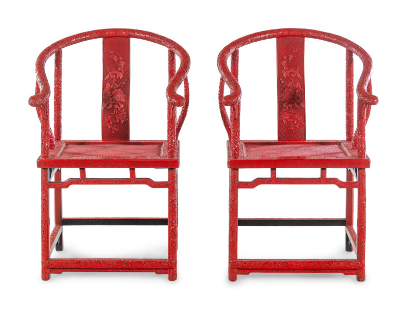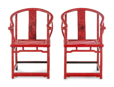 A Pair of Chinese Export Carved Red Lacquer Armchairs