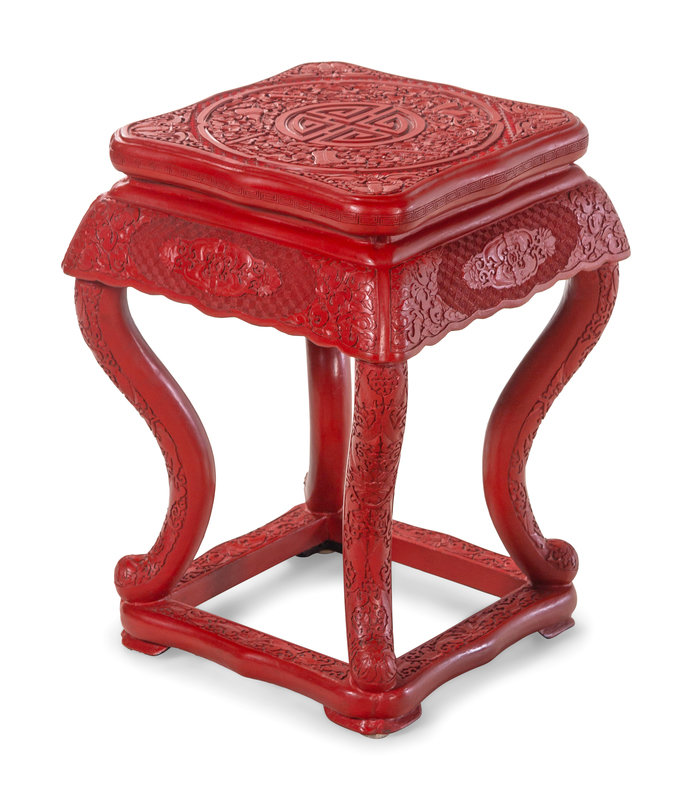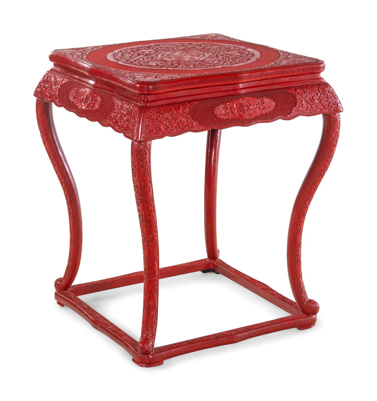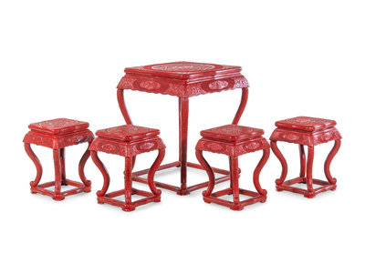A Chinese Export Carved Red Lacquer Game Table and Four Stools
