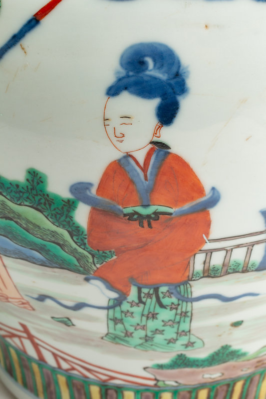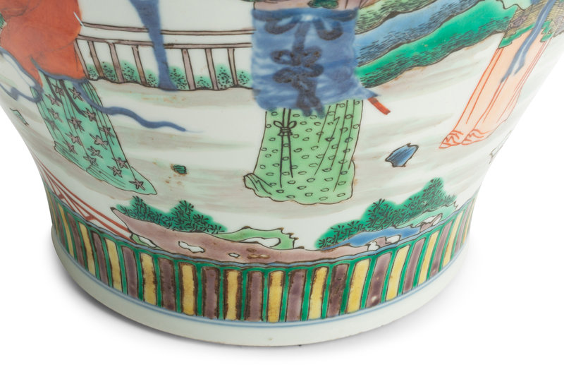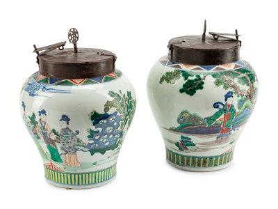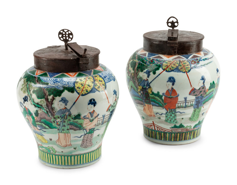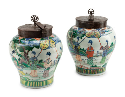 A Pair of Chinese Export Iron Mounted Famille Verte Porcelain Tea Jars