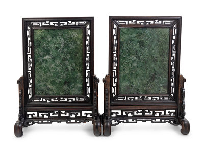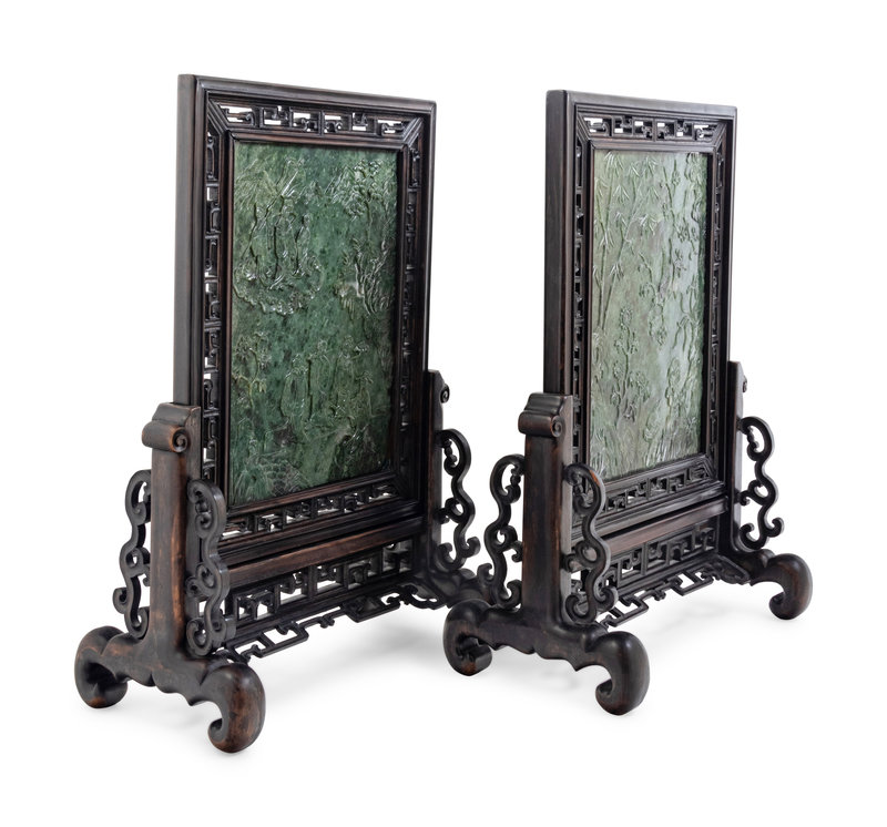 A Pair of Chinese Export Spinach Jade and Pierce Carved Hardwood Table Screens