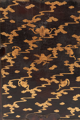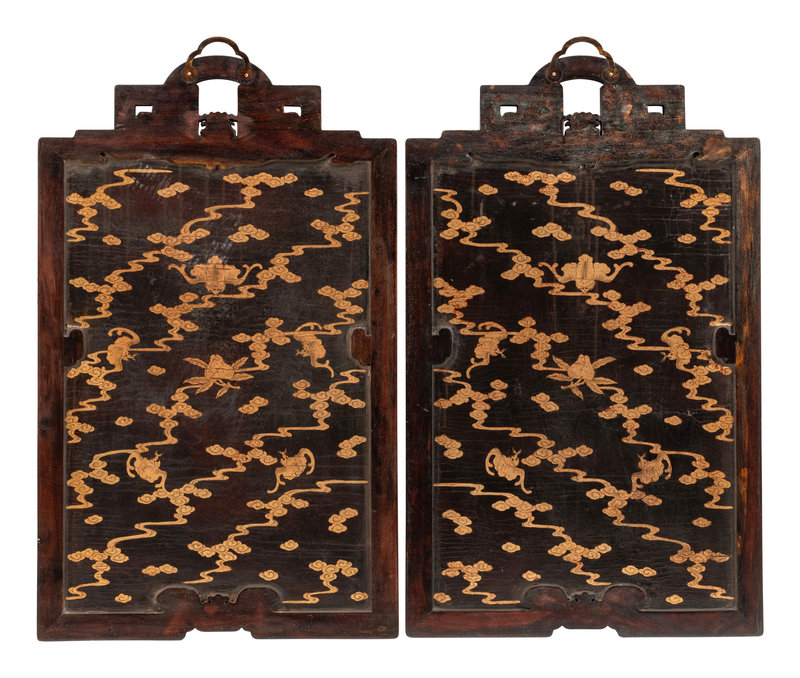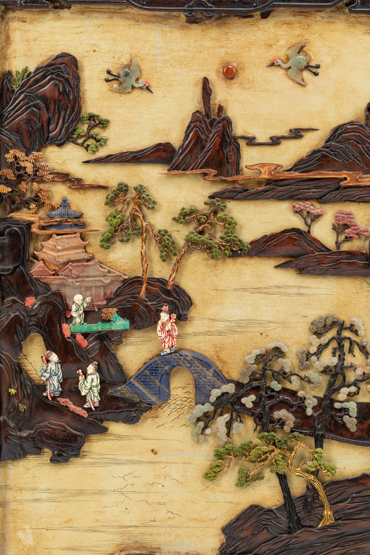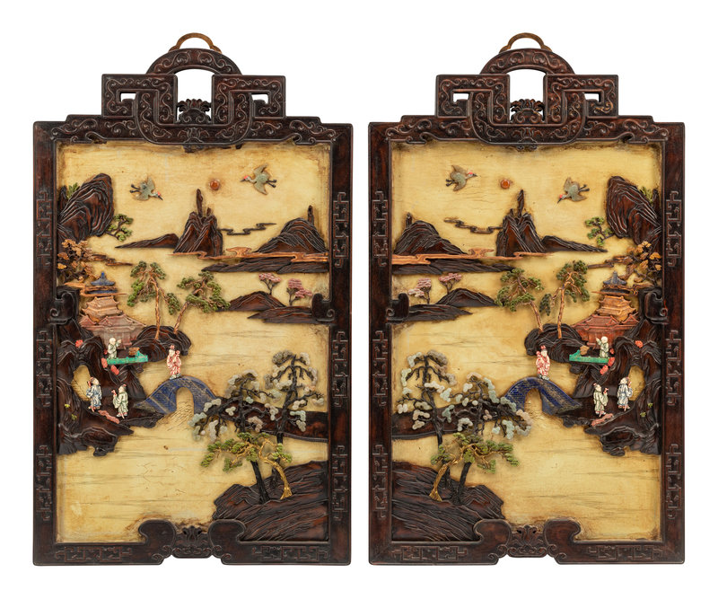 A Pair of Chinese Export Hardstone and Partial Lacquered Carved Wood Panels