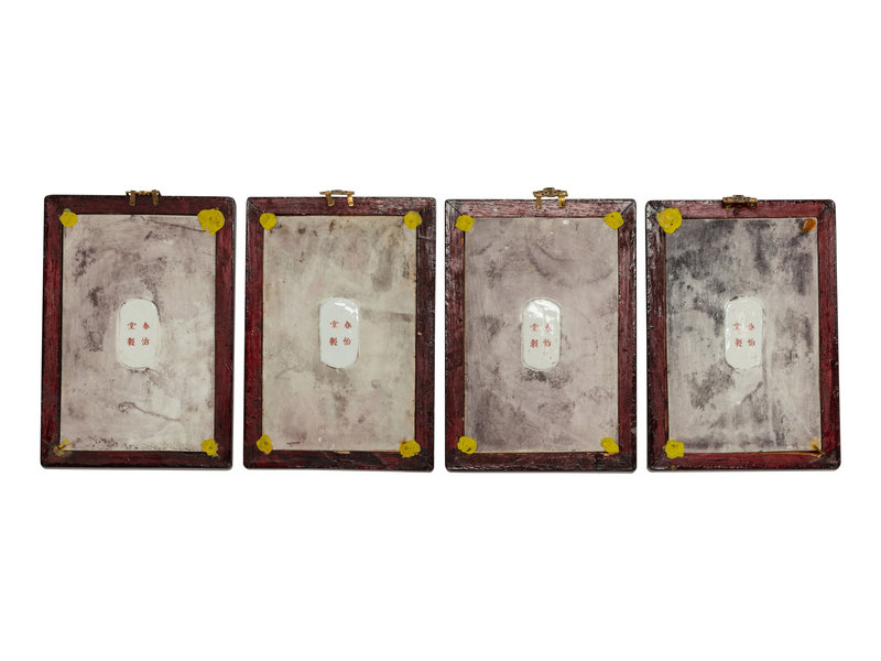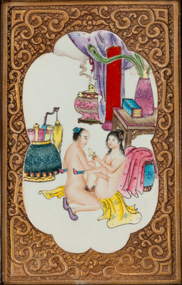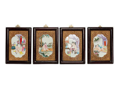 A Set of Four Chinese Export Gilt and Enameled Erotic Porcelain Plaques