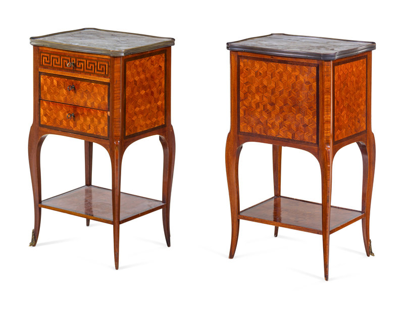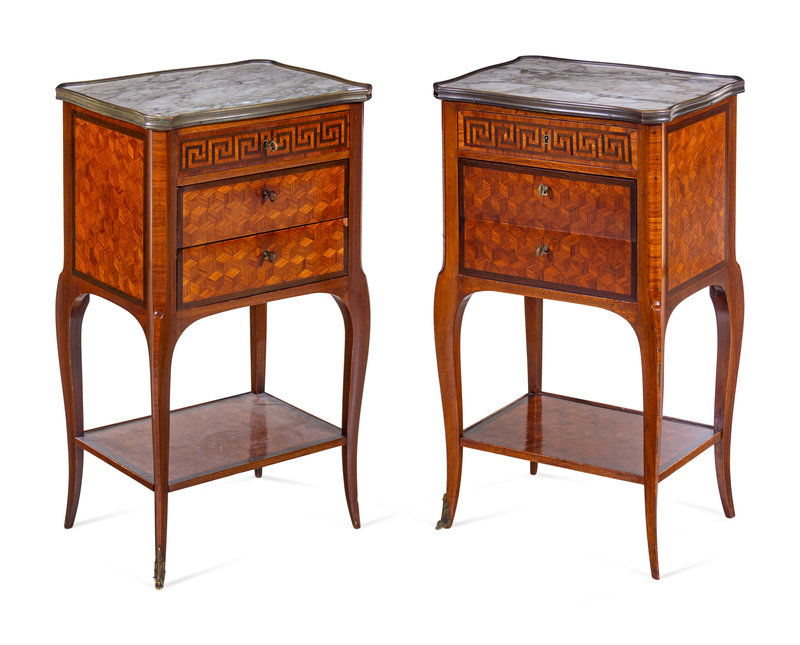 A Pair of Louis XV Style Parquetry Marble-Top Side Tables