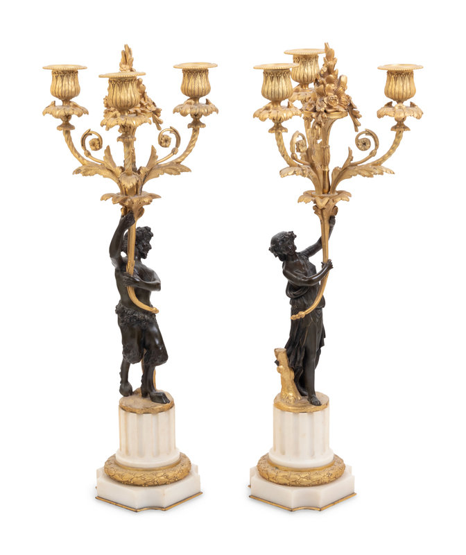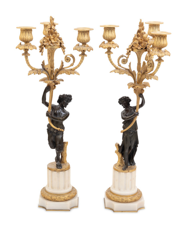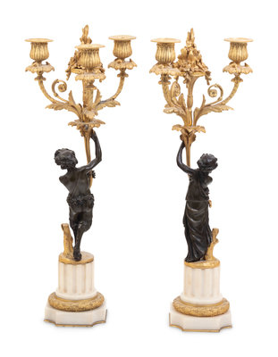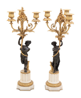 A Pair of Louis XVI Style Parcel Gilt and Bronze Three-Light Figural Candelabra