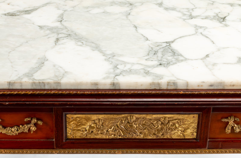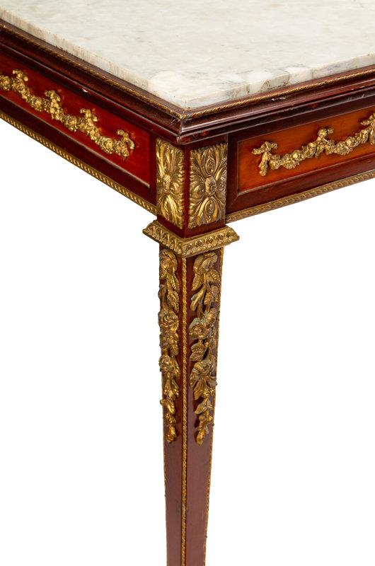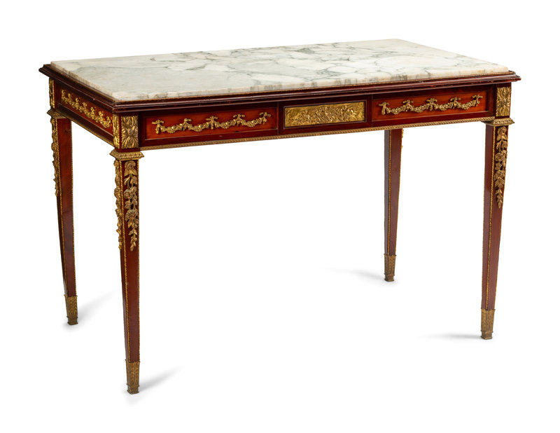 A Louis XVI Style Gilt Bronze Mounted Mahogany Marble-Top Center Table