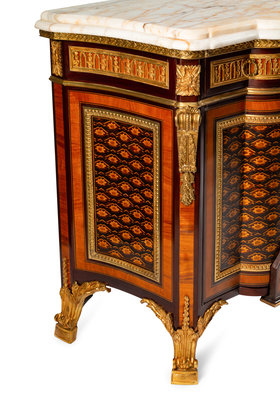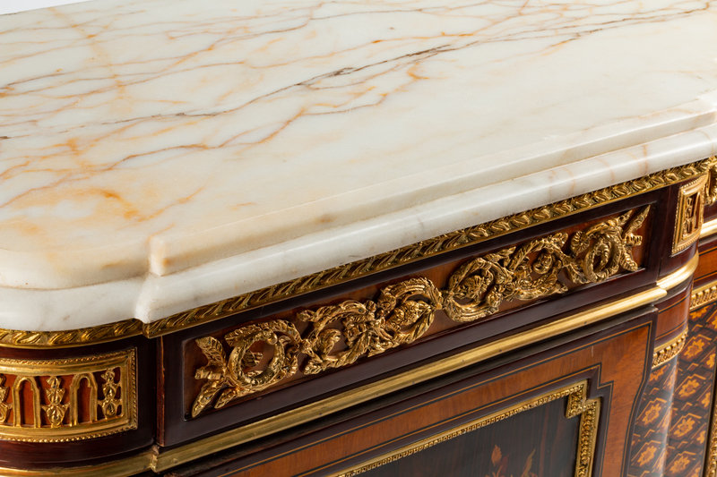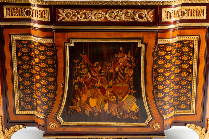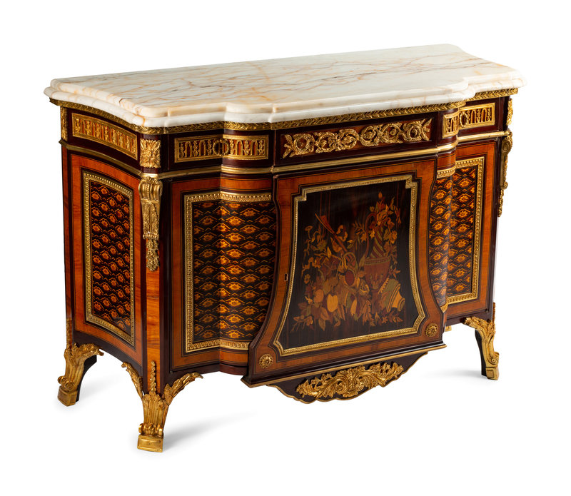 A Louis XVI Style Gilt Bronze Mounted Marquetry Marble-Top Cabinet
