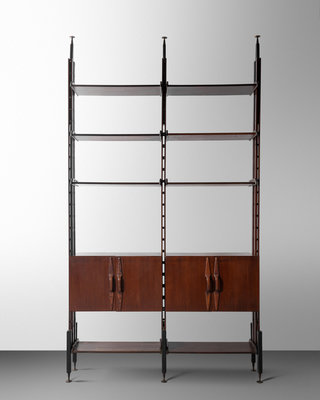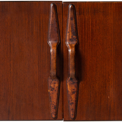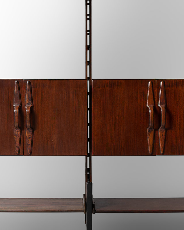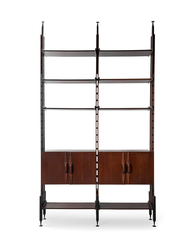 rosewood, ebonized wood, enameled steel, leather, brass