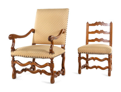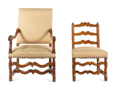 comprising an armchair and a ladder-back side chair; each with os de mouton carving.