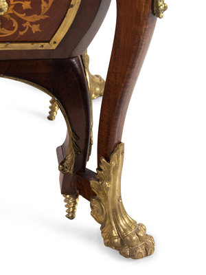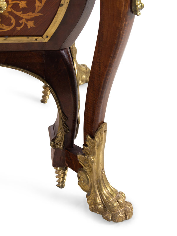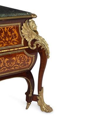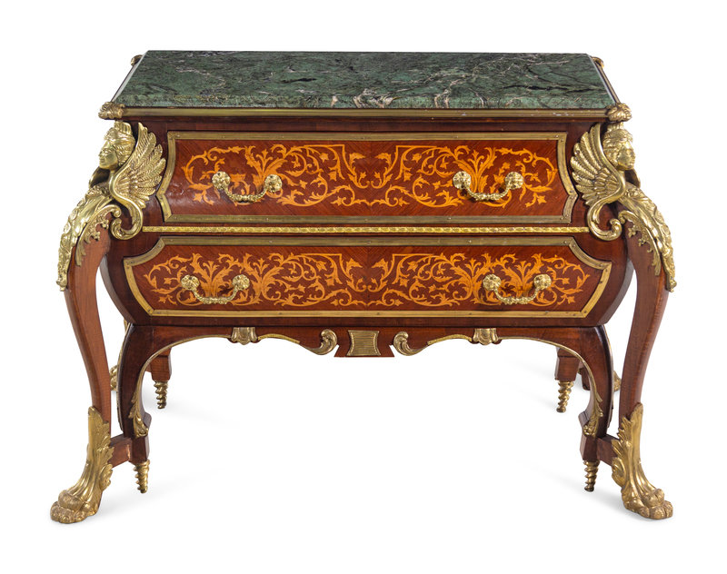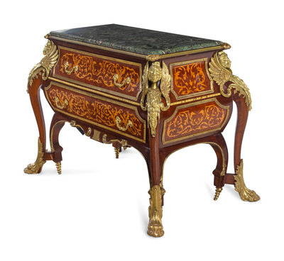A Louis XIV Style Gilt Metal Mounted Marquetry Marble-Top Commode After the Model by André-Charles Boulle