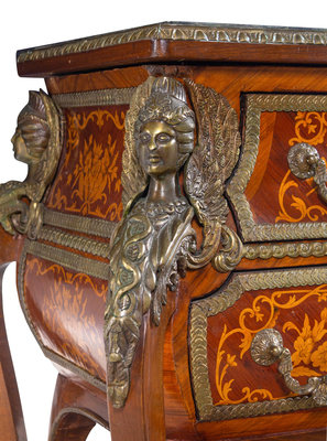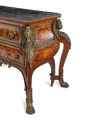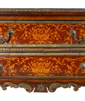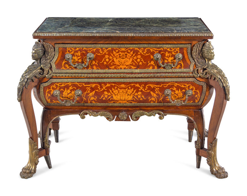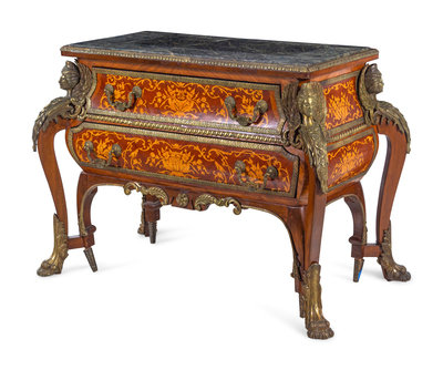 A Louis XIV Style Gilt Bronze Mounted Marquetry Marble-Top Commode After the Model by André-Charles Boulle