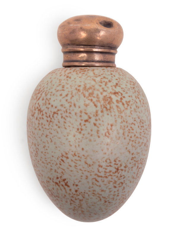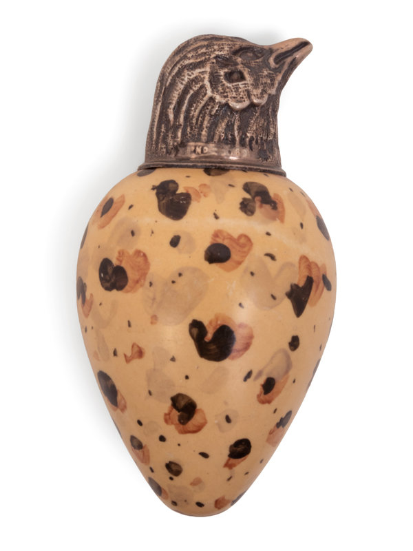 each in the form of a bird's egg, one silver cover realistically decorated in the form of a bird's head.