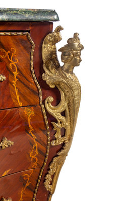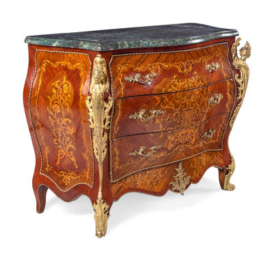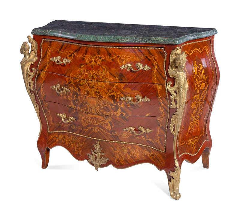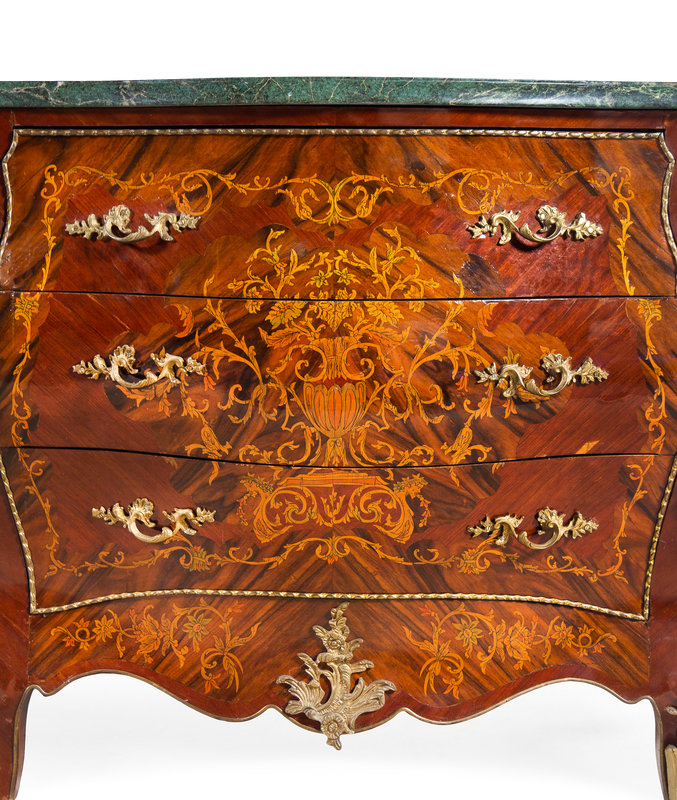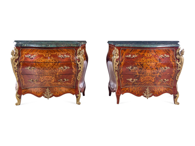 A Pair of Louis XV Style Gilt Metal Mounted Sans Traverse Inlaid Marble-Top Commodes
