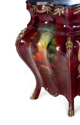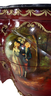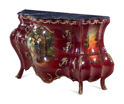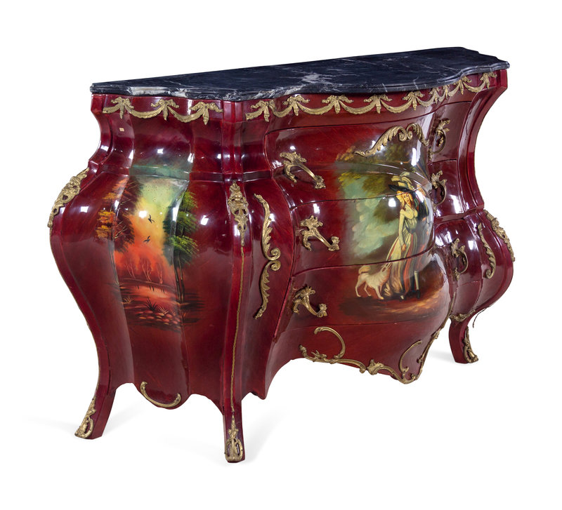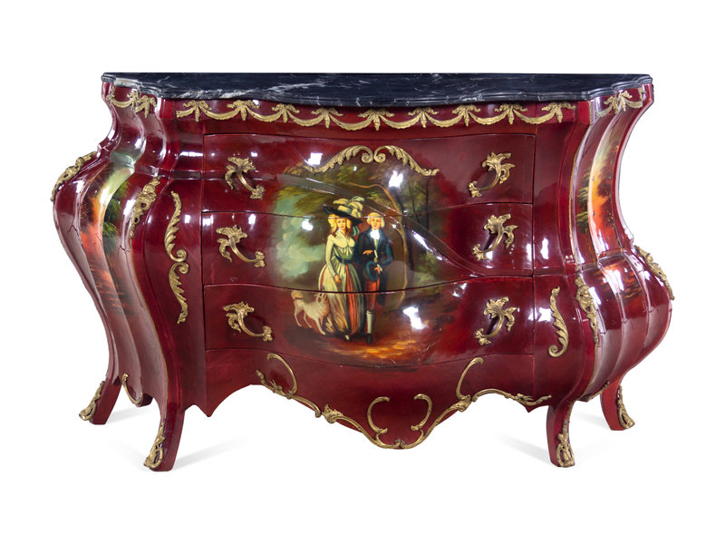 A Louis XV Style Gilt Metal and Vernis Martin Decorated Marble-Top Bombe Commode
