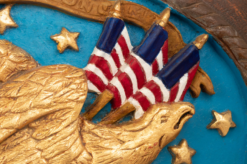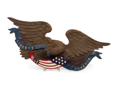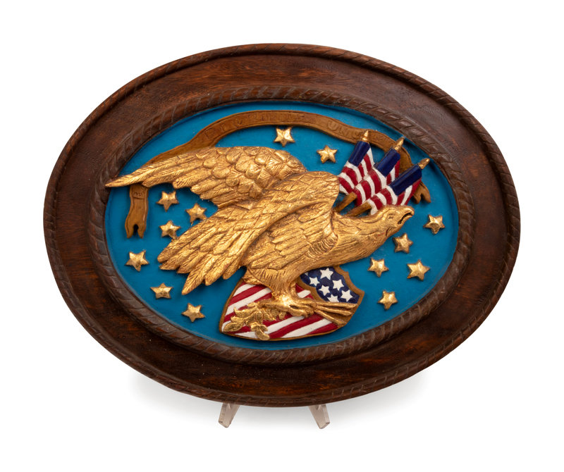 A Carved and Painted Eagle and a Carved, Painted and Parcel Gilt Eagle Plaque