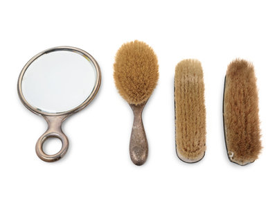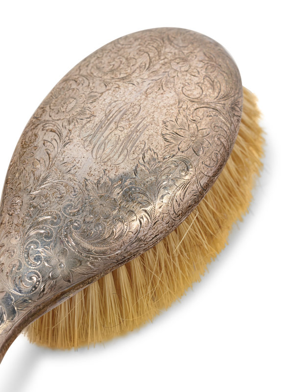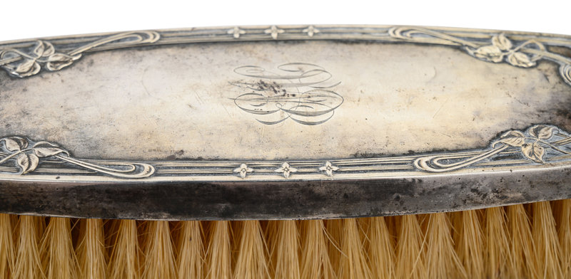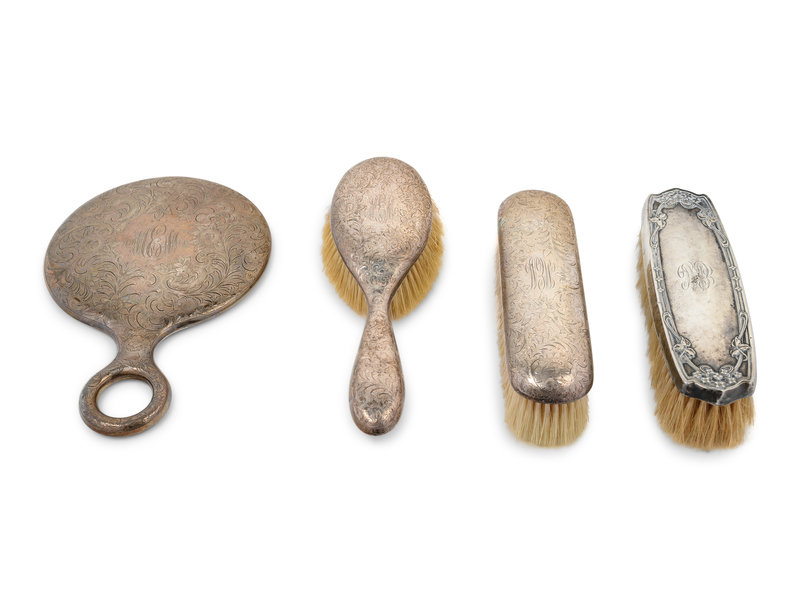 comprising a hand mirror and two brushes, each monogrammed MEM, together with a brush by Theodore W. Foster & Bro., Providence, RI, monogrammed EMC.