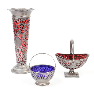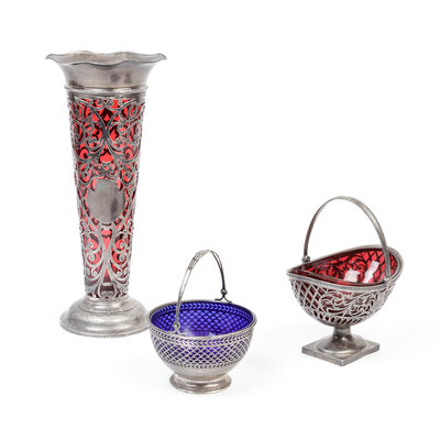 comprising a Graff, Washbourne & Dunn trumpet vase, a Gorham basket and another basket.